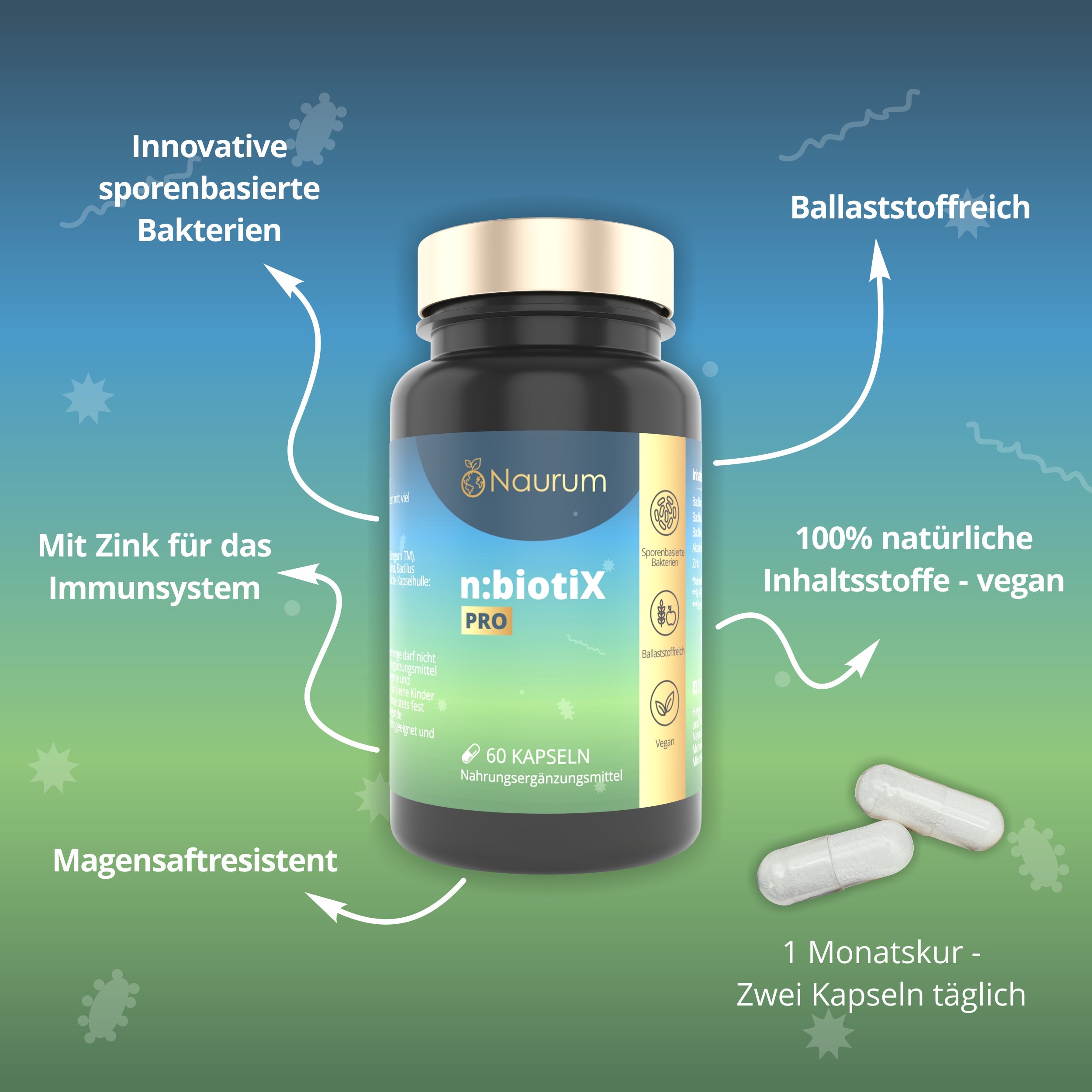 n:biotiX PRO von Naurum ist ein Nahrungsergänzungsmittel, das als Ergänzung zu einer ausgewogenen Ernährung entwickelt wurde. Die Zusammensetzung umfasst eine Auswahl an sporenbasierten Bakterienstämmen, Ballaststoffen, Akazienfaser und Zink. Das enthaltene Zink trägt zur normalen Funktion des Immunsystems bei.